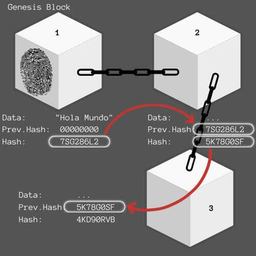 La Cadena de Bloques se origina a partir del Genesis Block o el Bloque Generador. ¿Pero cómo se encadena con otros bloques de información? Imaginemos que el bloque número 1, el genesis, ha sido creado y queremos añadir otro bloque de información; este segundo bloque llevará asociado como Prev. Hash el Hash del bloque genesis de esta manera ambos quedan encadenados. En este momento, a través de operaciones criptográficas, se genera un Hash para el bloque 2 combinando la información del propio bloque y la de su Prev. Hash. El tercer bloque se encadenaría de la misma manera: Su Prev. Hash será el Hash del bloque 2. De esta manera se crea una cadena de bloques con información distinta y vinculados criptográficamente.¿Qué sucede si se manipula la información de un bloque?Si esto ocurre, automáticamente el Hash del bloque en cuestión cambiará. De modo que el Prev. Hash registrado del siguiente no coincidirá con él. En este punto la cadena se rompe y será un indicativo de que los datos están en peligro.