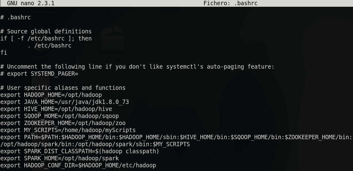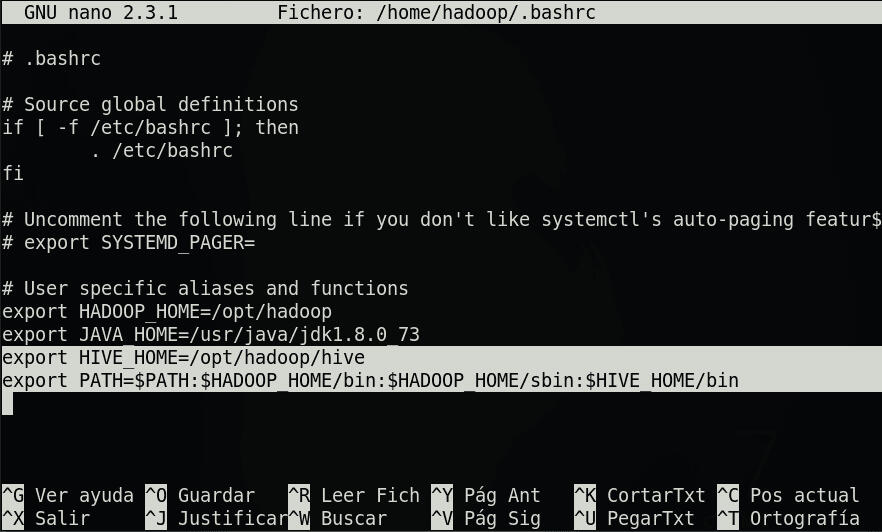 export HIVE\_HOME=/opt/hadoop/hiveEsta variable de entorno indicará la ruta dónde hemos alojado Hive. También debemos añadir los binarios de Hive al PATH para poder usar sus comandos desde cualquier sitio en la terminal::$HIVE\_HOME/binDe modo que al final el .bashrc se parecerá a esto: