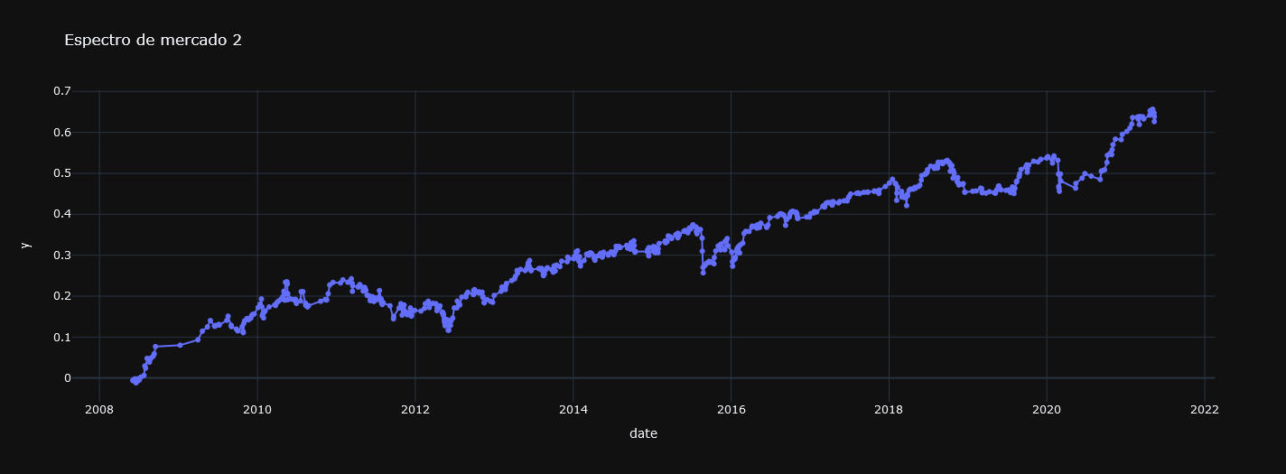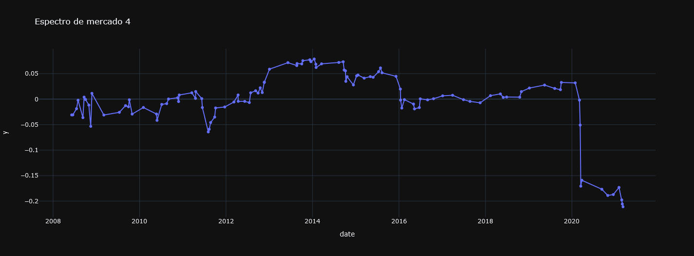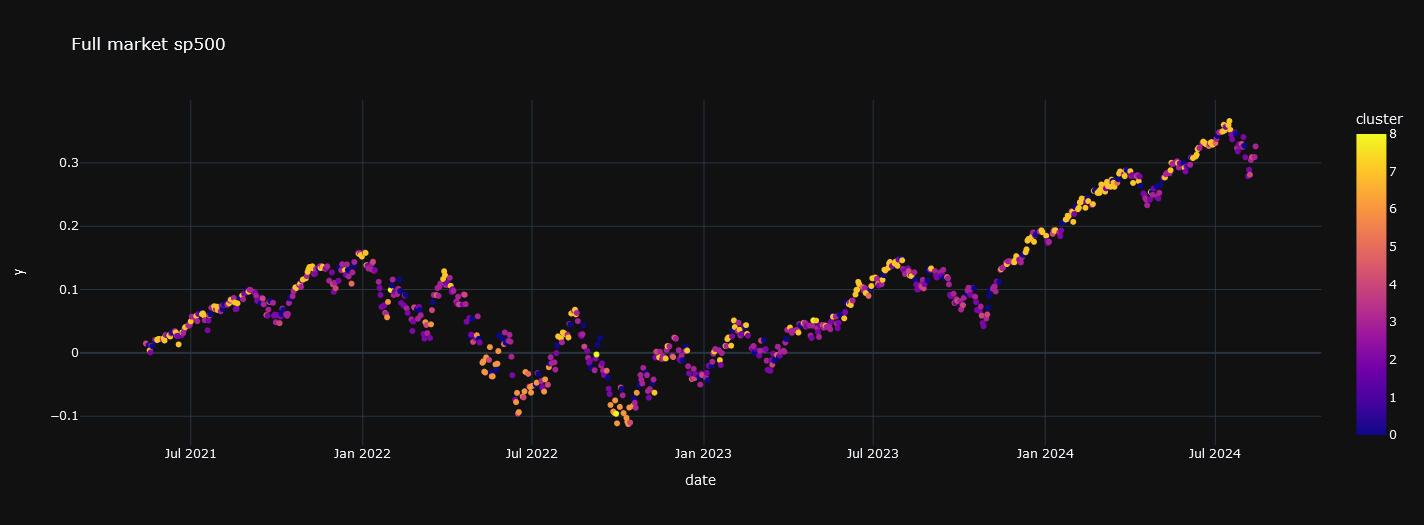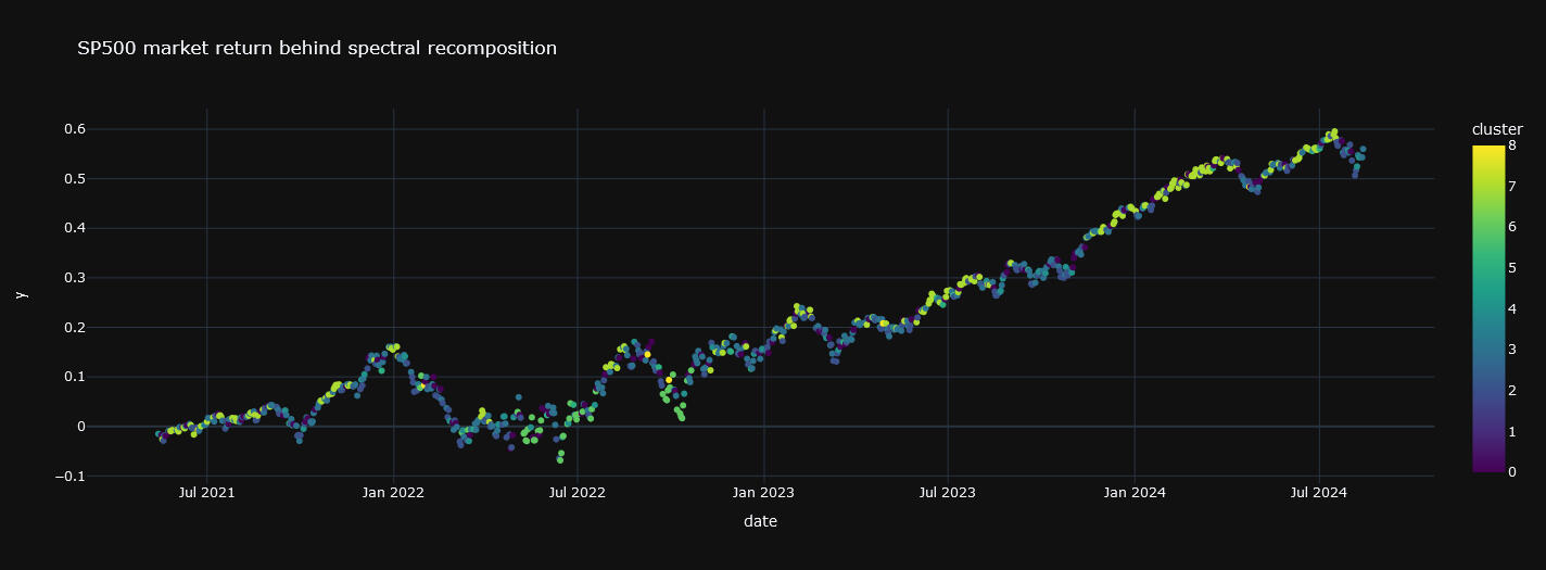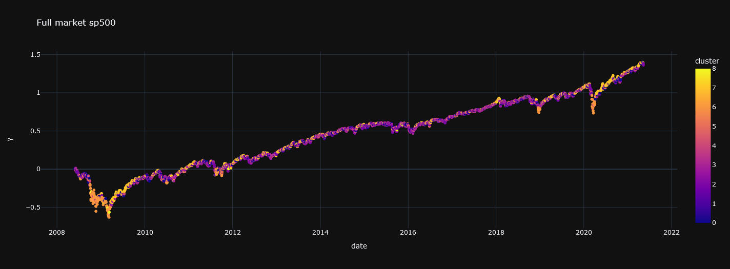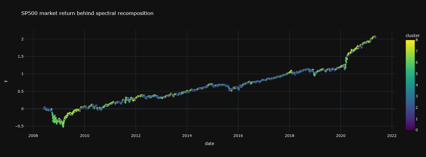 Su propósito principal es dividir un conjunto de datos en k grupos o clusters de manera que los elementos dentro de un mismo grupo sean más similares entre sí que a los de otros grupos. Vamos a descomponer de esta manera el SP500.En las siguiente gráfica se muestra el resultado de la descomposición: un espectro dónde aparecen del mismo color los retornos asociados a cada cluster, segmento o régimen de mercado.