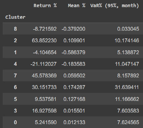 Tabla 1: Retornos, esperanzas matemáticas y VaRs asociados a cada segmento o cluster.
