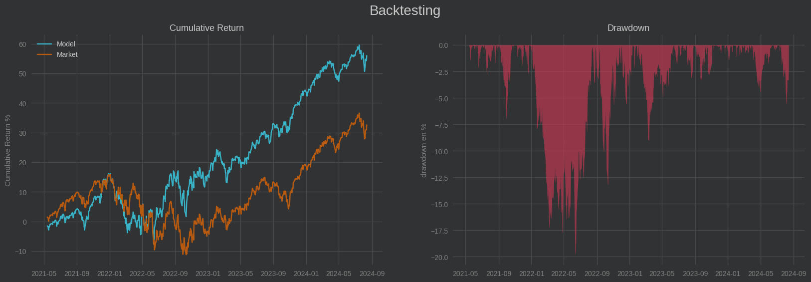Se puede observar que se llega a un rendimiento acumulado del 200% mientras que el SP500, sin aplicar esta estrategia, logra menos de un 150% (gráfica 1). Llama la atención el gran rendimiento que consigue en la crisis del covid.Dado que esta simple estrategia bate al mercado en el conjunto de entrenamiento el siguiente paso natural es ver si lo hace para datos que el modelo no conoce, es decir, en el conjunto de testing: